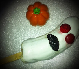 Slice the banana in half and peel. Insert the Popsicle stick vertically on the side you cut. Rub the marshmallow puff or melted white chocolate on the banana. Then create a ghost face. =)